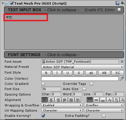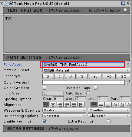 各位親愛的開發者一定要記住,這裡能夠使用的中文字只有在中文字庫中的可以用在TextMeshPro,所以可能要麻煩各位花點時間去做新增了!!!