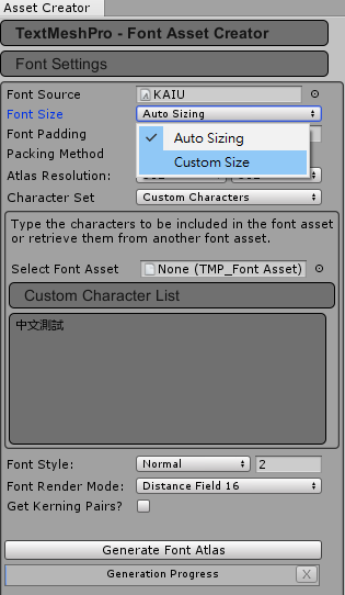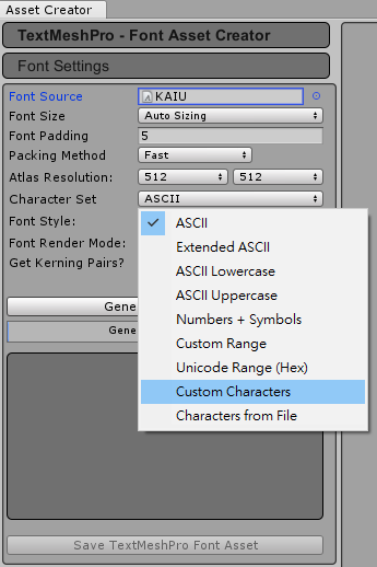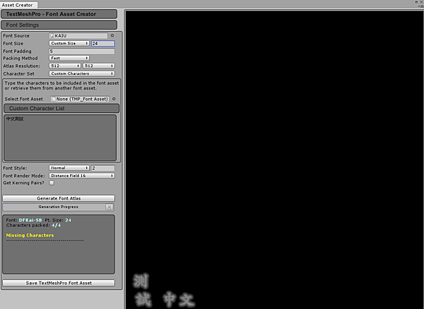 6. 在來就是生產字體囉!按下Generate Font Atlas開始生產字體,生產完畢後可以在右邊看到我們的字體庫(請自行新增自己所需要的文字)