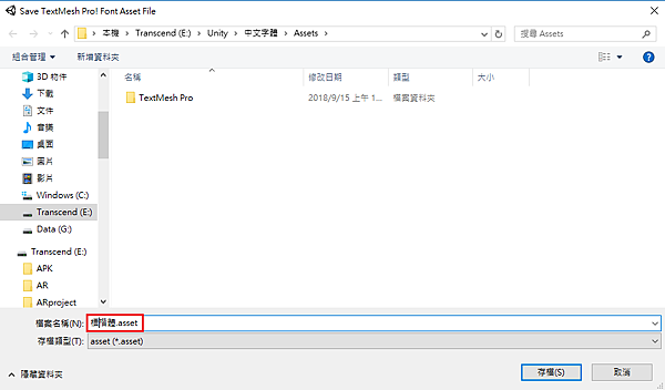 6. 確認沒有問題後,就按下最下方的Save TextMeshPro Font Asset,並且輸入新的文字檔案名稱儲存新的文字檔(方便辨識為主)
